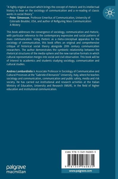 Chapter 1: Introduction.- Chapter 2: "Shared Symbols of a Community": Roger Silverstone and Media Commonplaces.- Chapter 3: "Metaphor Work": Richard Sennett and the Urban Rhetoric of Public Speaking.- Chapter 4: Mainstream Soliloquies: Erving Goffman and the Sociology of Self-Talk.- Chapter 5: Mythic Operators: Jean Baudrillard and the Rhetoric of Designation.- Chapter 6: Imaginary Myths: Roland Barthes and the Rhetorical Induction.- Chapter 7: Faded Metaphors: Walter Lippmann and the Rhetoric of News.- Chapter 8: The Values of the Gutenberg Era: Myth and Media Rhetoric.- Chapter 9: Digital Cosmopolitism: Ulrich Beck and Communication as "Public Bad".- Chapter 10: The Lure of Rhetoric: Jürgen Habermas and the Faltering European Project.- Chapter 11: Richard Sennett and "the New Rhetoric of the People": A Manzonian Path.- Chapter 12: Presence is Absence. Communication and Rhetoric in Paolo Sorrentino's The Young Pope.- Chapter 13: "Society is Predictable". Risk and Persuasion in Paolo Sorrentino's The New Pope.