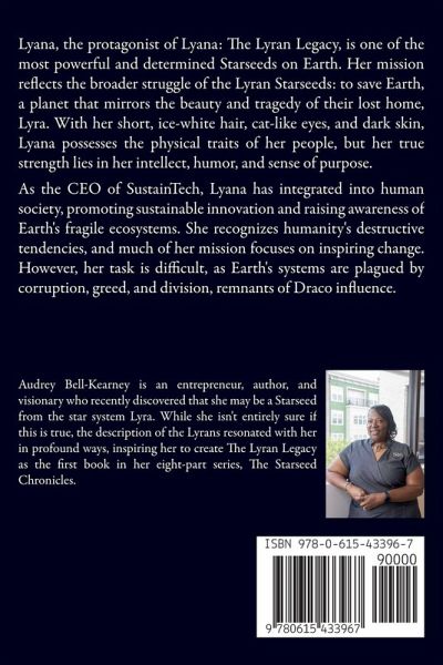 Lyana, the protagonist of Lyana: The Lyran Legacy, is one of the most powerful and determined Starseeds on Earth. Her mission reflects the broader struggle of the Lyran Starseeds: to save Earth, a planet that mirrors the beauty and tragedy of their lost home, Lyra. With her short, ice-white hair, cat-like eyes, and dark skin, Lyana possesses the physical traits of her people, but her true strength lies in her intellect, humor, and sense of purpose. As the CEO of SustainTech, Lyana has integrated into human society, promoting sustainable innovation and raising awareness of Earth's fragile ecosystems. She recognizes humanity's destructive tendencies, and much of her mission focuses on inspiring change. However, her task is difficult, as Earth's systems are plagued by corruption, greed, and division, remnants of Draco influence. Lyana's internal conflict-her love for humanity and frustration with its self-destructive nature-is central to the Lyran Legacy. Determined to prevent Earth from falling like Lyra, she races against time to awaken humanity and other hidden Starseeds who have forgotten their purpose.