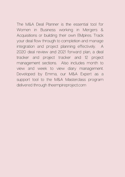 The M&A Deal Planner is the essential tool for savvy (and sassy) Female Entrepreneurs working in Mergers & Acquisitions and Female Founded Business Owners who want to build their own EMpires. Track your deal flow through to completion and manage integration and project planning effectively. A 2020 deal review and 2021 forward plan, a deal tracker and project tracker and 12 project management sections. Also includes month to view and week to view diary management.