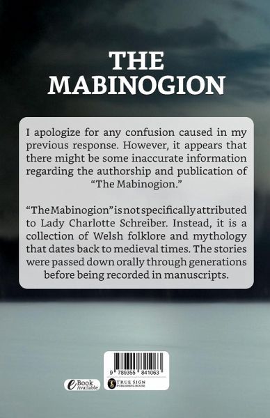 I apologize for any confusion caused in my previous response. However, it appears that there might be some inaccurate information regarding the authorship and publication of ""The Mabinogion."" ""The Mabinogion"" is not specifically attributed to Lady Charlotte Schreiber. Instead, it is a collection of Welsh folklore and mythology that dates back to medieval times. The stories were passed down orally through generations before being recorded in manuscripts.