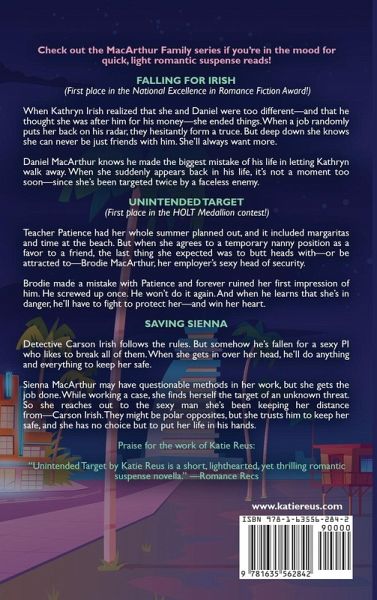 Check out the MacArthur Family series if you're in the mood for quick, light romantic suspense reads! FALLING FOR IRISH When Kathryn Irish realized that she and Daniel were too different-and that he thought she was after him for his money-she ended things. When a job randomly puts her back on his radar, they hesitantly form a truce. But deep down she knows she can never be just friends with him. She'll always want more. Daniel MacArthur knows he made the biggest mistake of his life in letting Kathryn walk away. When she suddenly appears back in his life, it's not a moment too soon-since she's been targeted twice by a faceless enemy. UNINTENDED TARGET Teacher Patience had her whole summer planned out, and it included margaritas and time at the beach. But when she agrees to a temporary nanny position as a favor to a friend, the last thing she expected was to butt heads with-or be attracted to-Brodie MacArthur, her employer's sexy head of security. Brodie made a mistake with Patience and forever ruined her first impression of him. He screwed up once. He won't do it again. And when he learns that she's in danger, he'll have to fight to protect her-and win her heart. SAVING SIENNA Detective Carson Irish follows the rules. But somehow he's fallen for a sexy PI who likes to break all of them. When she gets in over her head, he'll do anything and everything to keep her safe. Sienna MacArthur may have questionable methods in her work, but she gets the job done. While working a case, she finds herself the target of an unknown threat. So she reaches out to the sexy man she's been keeping her distance from-Carson Irish. They might be polar opposites, but she trusts him to keep her safe, and she has no choice but to put her life in his hands.