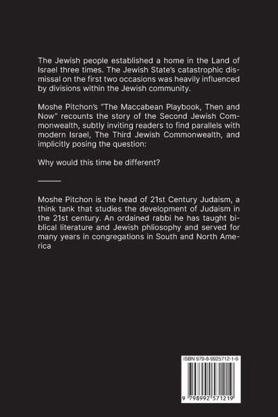 The Jewish people established a home in the Land of Israel three times. The Jewish State's catastrophic dismissal on the first two occasions was heavily influenced by divisions within the Jewish community. Moshe Pitchon's "The Maccabean Playbook, Then and Now" recounts the story of the Second Jewish Commonwealth, subtly inviting readers to find parallels with modern Israel, The Third Jewish Commonwealth, and implicitly posing the question: Why would this time be different?