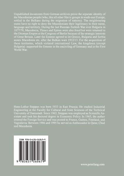 Unpublished documents from German archives prove the separate identity of the Macedonian people (who, like all other Slavic groups in south-east Europe, settled in the Balkans during the migration of nations). The neighbouring states have no right to deny the Macedonians their legitimacy to their name, language and territory. During the last Russian-Turkish War over Bulgaria in 1877/78, Macedonia, Thrace and Epirus were also freed but were returned to the Ottoman Empire at the Congress of Berlin because of the strategic interests of Great Britain. Later the Entente agreed to let Greece, Bulgaria and Serbia annex Macedonia etc. after the Balkan wars 1912/13. For the acquisition of these territories, which violated international Law, the kingdoms (except Bulgaria) supported the Entente in the encircling of Germany and in the First World War.