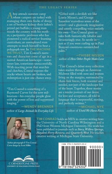 Winner, Short Story/Anthology, Midwest Book Awards (2025) A boy attends summer camp where campers are tasked with managing their own flocks of sheep; a set of brothers kidnap their father's prized pet buffalo; a young man travels the country with his mother, a peripatetic professor who has pioneered a radical service-learning curriculum; an unemployed man attempts to teach himself to beat a polygraph test. In The Machine We Trust, Tim Conrad's narrators and characters come of age in a surreal American landscape-sometimes late, sometimes unsuccessfully. With exacting prose that searches and clutches, Conrad exposes the cracks where hearts are broken, and redemption is just one chance away.