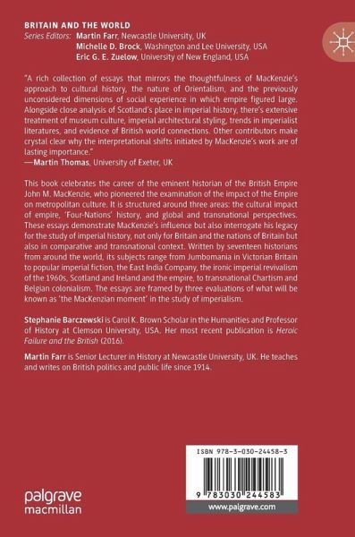 This book celebrates the career of the eminent historian of the British Empire John M. MacKenzie, who pioneered the examination of the impact of the Empire on metropolitan culture. It is structured around three areas: the cultural impact of empire, 'Four-Nations' history, and global and transnational perspectives. These essays demonstrate MacKenzie's influence but also interrogate his legacy for the study of imperial history, not only for Britain and the nations of Britain but also in comparative and transnational context. Written by seventeen historians from around the world, its subjects range from Jumbomania in Victorian Britain to popular imperial fiction, the East India Company, the ironic imperial revivalism of the 1960s, Scotland and Ireland and the empire, to transnational Chartism and Belgian colonialism. The essays are framed by three evaluations of what will be known as 'the MacKenzian moment' in the study of imperialism.