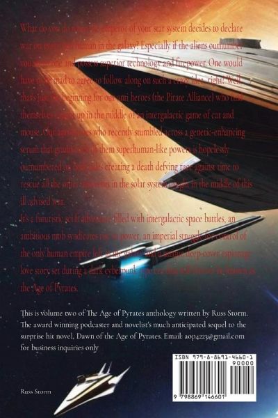 What do you do when the emperor of your star system decides to declare war on every non-human government in the galaxy? Especially if the aliens outnumber humans six to one and possess superior technology and firepower? One would have to be positively mad to follow along on such a crazy idea, right? Well, that's just the beginning for our antiheroes (the Pirate Alliance) who find themselves caught up in the middle of an intergalactic cat and mouse. Our antiheroes just recently stumbled across a genetic-enhancing serum that gave each of them superhuman-like powers and is hopelessly outnumbered on both sides creating a death-defying race against time to rescue all the other innocents in the solar system caught in the middle of this ill-advised war. It's a futuristic sci-fi adventure filled with intergalactic space battles, an ambitious mob syndicate rise to power, an imperial struggle for control of the empire, and a deep-cover espionage love story set during a dark cyberpunk type era that will forever be known as The Age of Pyrates