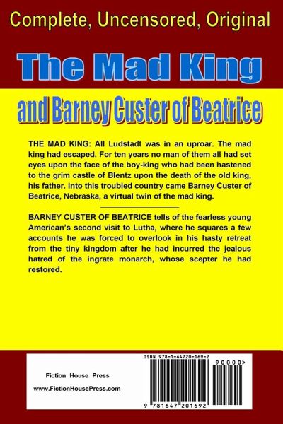 THE ORIGINAL MAGAZINE TEXT! THE MAD KING: All Ludstadt was in an uproar. The mad king had escaped. For ten years no man of them all had set eyes upon the face of the boy-king who had been hastened to the grim castle of Blentz upon the death of the old king, his father. Into this troubled country came Barney Custer of Beatrice, Nebraska, a virtual twin of the mad king. BARNEY CUSTER OF BEATRICE tells of the fearless young American's second visit to Lutha, where he squares a few accounts he was forced to overlook in his hasty retreat from the tiny kingdom after he had incurred the jealous hatred of the ingrate monarch, whose scepter he had restored.