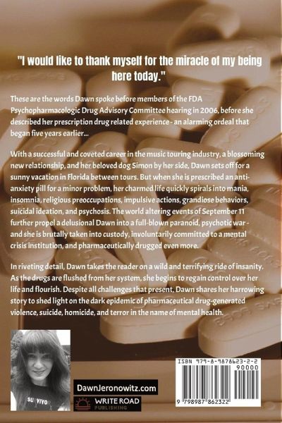 "I would like to thank myself for the miracle of my being here today." These are the words Dawn spoke before members of the FDA Psychopharmacologic Drug Advisory Committee hearing in 2006, before she described her prescription drug related experience - an alarming ordeal that began five years earlier... With a successful and coveted career in the music touring industry, a blossoming new relationship, and her beloved dog Simon by her side, Dawn sets off for a sunny vacation in Florida between tours. But when she is prescribed an anti-anxiety pill for a minor problem, her charmed life quickly spirals into mania, insomnia, religious preoccupations, impulsive actions, grandiose behaviors, suicidal ideation, and psychosis. The world altering events of September 11 further propel a delusional Dawn into a full-blown paranoid, psychotic war - and she is brutally taken into custody, involuntarily committed to a mental crisis institution, and pharmaceutically drugged even more. In riveting detail, Dawn takes the reader on a wild and terrifying ride of insanity. As the drugs are flushed from her system, she begins to regain control over her life and flourish. Despite all challenges that present, Dawn shares her harrowing story to shed light on the dark epidemic of pharmaceutical drug-generated violence, suicide, homicide, and terror in the name of mental health. A mental health psychopharmacology memoir, The Mad Road is a fully forthcoming account spanning over two decades of a life entrapped in the mental health system. Medications, involuntary commitments, police and medical transgressions filled with psychosis, diagnosis and madness are described in harrowing detail; bolstered by medical records, police reports and full color photo images. Clarity comes in the form of education, connection that leads toward a path of political activism, meetings with elected representatives, plus a testimony to the FDA. A well-documented timeline of violence, tragedies, weaponization and warnings are substantiated by resources and pictures. The power of unconditional love, humanity, empathy, and will-to-live is driving throughout with clear purpose: to help generate a safer, healthier, more stable society. The Mad Road is a story of truth that will open your eyes, break your heart, lift your soul and make you think. And it just may inspire you to believe in yourself too.