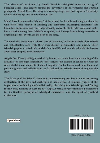 "The Madcap of the School" by Angela Brazil is a delightful novel set in a girls' boarding school and centers around the adventures of its vivacious and spirited protagonist, Mabel Ross. The story is a coming-of-age tale that explores friendship, loyalty, and the ups and downs of school life. Mabel Ross, known as the "Madcap" of the school, is a lovable and energetic character who often finds herself in amusing and sometimes challenging situations. Her boundless enthusiasm and cheerful personality endear her to her classmates and make her a favorite among them. Mabel's escapades, which range from solving mysteries to organizing school events, are the heart of the story. The novel also introduces a colorful cast of characters, including Mabel's close friends and schoolmates, each with their own distinct personalities and quirks. These friendships play a central role in Mabel's school life and provide valuable life lessons about trust, support, and camaraderie. Angela Brazil's storytelling is marked by humor, wit, and a keen understanding of the dynamics of schoolgirl friendships. She captures the essence of school life, with its rules, rivalries, and moments of shared laughter. The book also touches on themes of personal growth and self-discovery as Mabel and her friends mature throughout the story. "The Madcap of the School" is not only an entertaining read but also a heartwarming exploration of the joys and challenges of adolescence. It reminds readers of the importance of embracing one's individuality, cherishing true friendships, and finding the fun and adventure in everyday life. Angela Brazil's novel continues to be cherished for its timeless portrayal of schoolgirl camaraderie and the spirit of youthful exuberance.