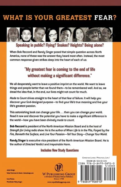 We all desperately want to leave a positive imprint on the world. We want to leave things and people better than we found them - to be remembered well. And so, we dread the idea that, in the end, our lives might not count for much. Made to Count drives straight to the heart of that fear of failure. It will help you discover your God-designed purpose - to find your life's true meaning and live your life's greatest passion. Using eight powerful biblical principles that are revolutionizing people's lives, as well as the fascinating stories of those changed by them, Reccord and Singer teach you how to hear God's call and discover His specific plan for you. These principles transcend time, cultures, and occupations. They are broadly universal and, yet, individually unique. This astonishing book can change your life . . . then you can change your world. Read it now and discover the potential you have to make a significant difference in the world - how you have been divinely made to count.