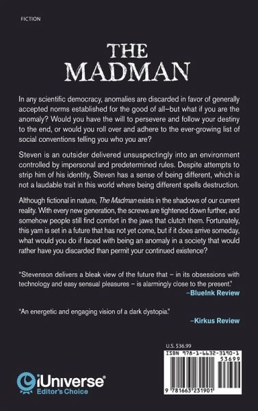 THE MADMAN In any scientific democracy, anomalies are discarded in favor of generally accepted norms established for the good of all-but what if you are the anomaly? Would you have the will to persevere and follow your destiny to the end, or would you roll over and adhere to the ever-growing list of social conventions telling you who you are? Steven is an outsider delivered unsuspectingly into an environment controlled by impersonal and predetermined rules. Despite attempts to strip him of his identity, Steven has a sense of being different, which is not a laudable trait in this world where being different spells destruction. Although fictional in nature, The Madman exists in the shadows of our current reality. With every new generation, the screws are tightened down further, and somehow people still find comfort in the jaws that clutch them. Fortunately, this yarn is set in a future that has not yet come, but if it does arrive someday, what would you do if faced with being an anomaly in a society that would rather have you discarded than permit your continued existence? "Stevenson delivers a bleak view of the future that - in its obsessions with technology and easy sensual pleasures - is alarmingly close to the present." -BlueInk Review "An energetic and engaging vision of a dark dystopia." -Kirkus Review