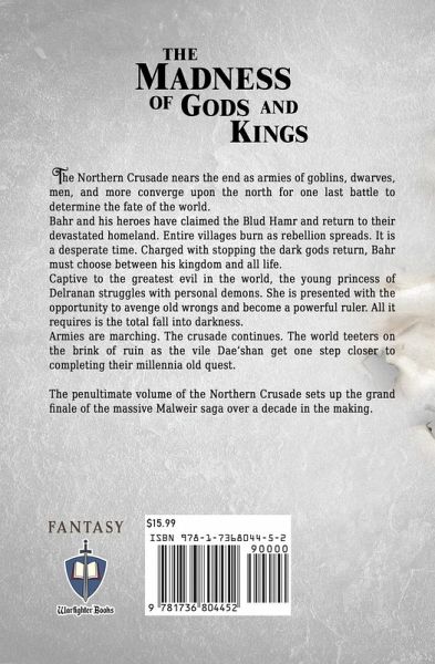 The Northern Crusade nears the end as armies of goblins, dwarves, men, and more converge upon the north for one last battle to determine the fate of the world. Bahr and his heroes have claimed the Blud Hamr and return to their devastated homeland. Entire villages burn as rebellion spreads. It is a desperate time. Charged with stopping the dark gods return, Bahr must choose between his kingdom and all life. Captive to the greatest evil in the world, the young princess of Delranan struggles with personal demons. She is presented with the opportunity to avenge old wrongs and become a powerful ruler. All it requires is the total fall into darkness. Armies are marching. The crusade continues. The world teeters on the brink of ruin as the vile Dae'shan get one step closer to completing their millennia old quest. The penultimate volume of the Northern Crusade sets up the grand finale of the massive Malweir saga over a decade in the making.