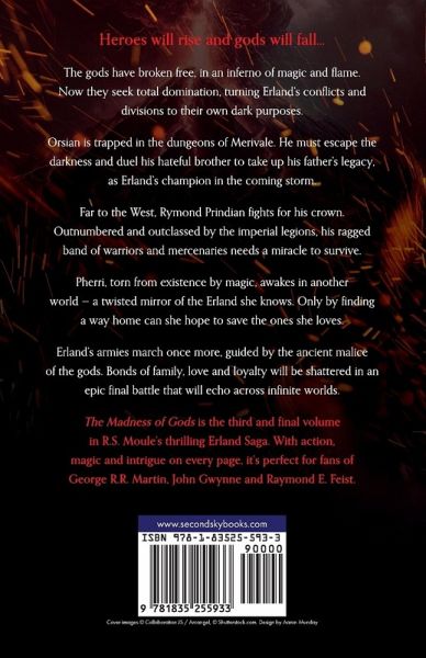 Heroes will rise and gods will fall... The gods have broken free, in an inferno of magic and flame. Now they seek total domination, turning Erland's conflicts and divisions to their own dark purposes. Orsian is trapped in the dungeons of Merivale. He must escape the darkness and duel his hateful brother to take up his father's legacy, as Erland's champion in the coming storm. Far to the West, Rymond Prindian fights for his crown. Outnumbered and outclassed by the imperial legions, his ragged band of warriors and mercenaries needs a miracle to survive. Pherri, torn from existence by magic, awakes in another world-a twisted mirror of the Erland she knows. Only by finding a way home can she hope to save the ones she loves. Erland's armies march once more, guided by the ancient malice of the gods. Bonds of family, love and loyalty will be shattered in an epic final battle that will echo across infinite worlds. The Madness of Gods is the third and final volume in R.S. Moule's thrilling Erland Saga. With action, magic and intrigue on every page, it's perfect for fans of George R.R. Martin, John Gwynne and Raymond E. Feist. See why readers love The Erland Saga: "Breath taking. I did not want this book to end. Please can I have the next book now PLEASE. A must-read for all lovers of this genre. Loved, loved it!!!!!!!!!" Goodreads reviewer ¿¿¿¿¿ "Superb... I put R.S. Moule right up there with Tolkien and George R.R. Martin, in terms of the intricate world building and how gradually different narratives and characters come together in the overall plot... This is the best stuff I've read in ages, and I read a lot!" Goodreads reviewer ¿¿¿¿¿ "If you thought the first book of the Erland Saga was intense, you better strap yourself down tight... Like a hurricane bearing down on you... Perfect for fans of George R.R. Martin and John Gwynne. The writing, character development, and vivid battles will have you staying up until ungodly AM hours just waiting to see what happens next." Goodreads reviewer ¿¿¿¿¿ "My favourite fantasy series is A Song of Ice and Fire and although I've read some excellent fantasy since, it is hard to find something with the same ingredients, while still feeling original. The Erland Saga... has this same magic recipe and I am incredibly happy I've found it. Warring factions, awesome characters, plans put into motion, twists, turns and backstabbing, multiple character POVs coming together, creating explosive moments. And of course, a well thought out world with a great magic system and immersive storytelling." Spells and Spaceships ¿¿¿¿¿ "Political intrigue and manoeuvring, betrayal, assassinations, an interesting magic system, sweeping mountains, warring kingdoms, treacherous landscapes, and a diverse cast of characters with complex motivations... Must-read for fantasy enthusiasts. I can't wait for the next installment!" @musings_marginalia_miscellanea ¿¿¿¿¿ "I had a great time returning to this rich and complex world. Magic, war, betrayals, revenge and political maneuverings... The desire to know the outcome will have readers flipping the pages." Totally Addicted 2 Reading ¿¿¿¿¿