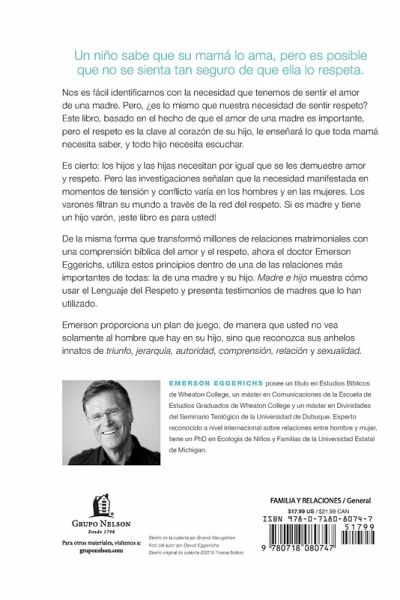 Al igual que Emerson Eggerichs transform¿¿ millones de relaciones matrimoniales con un entendimiento b¿¿blico del amor y el respeto, ahora dirige esos principios a una de las relaciones m¿¿s importantes de todas: una madre y su hijo. El amor es importante, pero el respeto es la clave al coraz¿¿n de tu hijo. La idea de que las mam¿¿s respeten a sus hijos puede sonar ajena para algunos, pero tambi¿¿n parece encender curiosidad. Es f¿¿cil identificarse con la necesidad que todos sentimos del amor de una madre, pero ¿¿es eso lo mismo que respeto? Incluso para los ni¿¿os peque¿¿os, el efecto del respeto no es nada menos que asombroso cuando se aplica apropiadamente. Las mam¿¿s desean aprender cualquier cosa que les ayude con sus hijos. Despu¿¿s de todo, aman a sus hijos, pero a muchas de ellas les resulta m¿¿s dif¿¿cil criarlos que a las ni¿¿as, especialmente desde los cuatro ä¿os de edad en adelante. Lo que hace que todo esto sea m¿¿s urgente es que las mam¿¿s est¿¿n entrenando a los padres para amar a sus hijas, pero nadie ha dicho nada a las mam¿¿s sobre c¿¿mo mostrar respeto a sus hijos, al menos no de una forma que sea aplicable y completamente explicada. Todos entienden que las ni¿¿as peque¿¿as necesitan el amor de pap¿¿, pero ¿¿qui¿¿n est¿¿ promocionando con fuerza la verdad de que los ni¿¿os peque¿¿os (y los grandes) necesitan el respeto de mam¿¿? No es exträ¿o que las madres sientan que no saben nada sobre este tema. Al igual que Emerson Eggerichs transform¿¿ millones de relaciones matrimoniales con un entendimiento b¿¿blico del amor y el respeto, ahora dirige esos principios a una de las relaciones m¿¿s importantes de todas: una madre y su hijo.