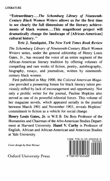 The Colored American Magazine, first published in 1900, was a pioneering forum for black literary talent. Pauline Hopkins was not only a prolific contributor, but one of its powerful editorial forces. These stories reveal her commitment to fiction as a vehicle for social change, weaving themes such as white oppression, the heroism of black women, and the need for organized resistance to persecution, into the narrative formulas of popular fiction.