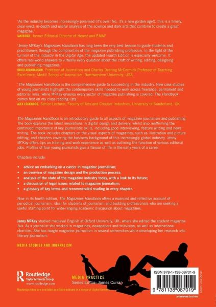 'Jenny McKay's Magazines Handbook has long been the very best beacon to guide students and practitioners through the complexities of the magazine publishing profession. In the light of the turmoil of the industry in the Digital Age, the updated Fourth Edition is especially welcome. It offers real-world answers to virtually every question about the craft of writing, editing, designing and publishing magazines.' David Abrahamson, Professor of Journalism and Charles Deering McCormick Professor of Teaching Excellence, Medill School of Journalism, Northwestern University, USA