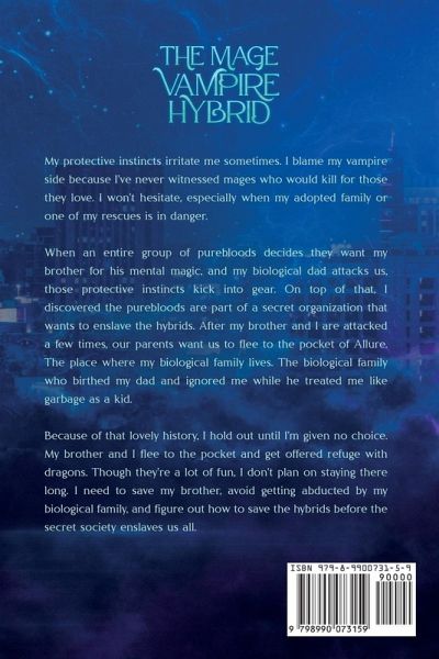 My protective instincts irritate me sometimes. I blame my vampire side because I've never witnessed mages who would kill for those they love. I won't hesitate, especially when my adopted family or one of my rescues is in danger. When an entire group of purebloods decides they want my brother for his mental magic, and my biological dad attacks us, those protective instincts kick into gear. On top of that, I discovered the purebloods are part of a secret organization that wants to enslave the hybrids. After my brother and I are attacked a few times, our parents want us to flee to the pocket of Allure. The place where my biological family lives. The biological family who birthed my dad and ignored me while he treated me like garbage as a kid. Because of that lovely history, I hold out until I'm given no choice. My brother and I flee to the pocket and get offered refuge with dragons. Though they're a lot of fun, I don't plan on staying there long. I need to save my brother, avoid getting abducted by my biological family, and figure out how to save the hybrids before the secret society enslaves us all. The Mage Vampire Hybrid (Paranormals of Ahl Book 2.5) is a 200-page story from the POV of the hybrid discovered in Bug Magic.