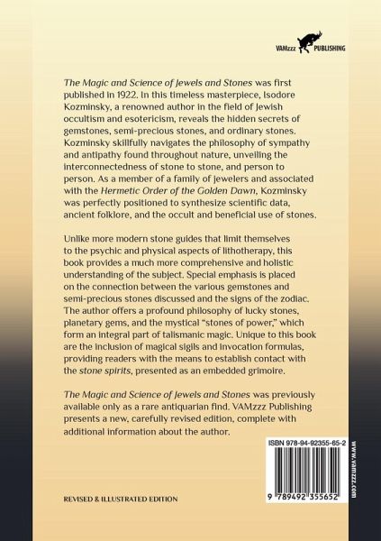 The Magic and Science of Jewels and Stones was first published in 1922. In this timeless masterpiece, Isodore Kozminsky, a renowned author in the field of Jewish occultism and esotericism, reveals the hidden secrets of gemstones, semi-precious stones, and ordinary stones. Kozminsky skillfully navigates the philosophy of sympathy and antipathy found throughout nature, unveiling the interconnectedness of stone to stone, and person to person. As a member of a family of jewelers and associated with the Hermetic Order of the Golden Dawn, Kozminsky was perfectly positioned to synthesize scientific data, ancient folklore, and the occult and beneficial use of stones. Unlike more modern stone guides that limit themselves to the psychic and physical aspects of lithotherapy, this book provides a much more comprehensive and holistic understanding of the subject. Special emphasis is placed on the connection between the various gemstones and semi-precious stones discussed and the signs of the zodiac. The author offers a profound philosophy of lucky stones, planetary gems, and the mystical "stones of power," which form an integral part of talismanic magic. Unique to this book are the inclusion of magical sigils and invocation formulas, providing readers with the means to establish contact with the stone spirits, presented as an embedded grimoire. The Magic and Science of Jewels and Stones was previously available only as a rare antiquarian find. VAMzzz Publishing presents a new, carefully revised edition, complete with additional information about the author.