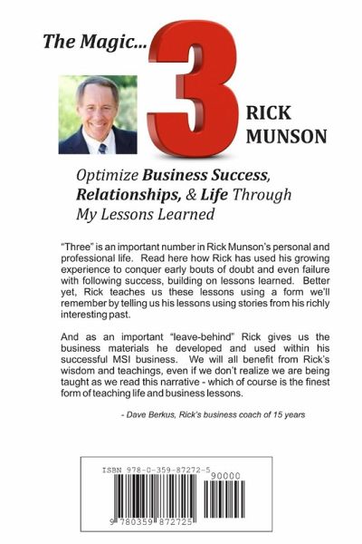 "Three" is an important number in Rick Munson's personal and professional life. Read here how Rick has used his growing experience to conquer early bouts of doubt and even failure with following success, building on lessons learned. Better yet, Rick teaches us these lessons using a form we'll remember by telling us his lessons using stories from his richly interesting past. And as an important "leave-behind" Rick gives us the business materials he developed and used within his successful MSI business. We will all benefit from Rick's wisdom and teachings, even if we don't realize we are being taught as we read this narrative - which of course is the finest form of teaching life and business lessons. - Dave Berkus, Rick's business coach of 15 years