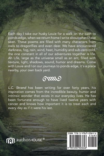 Each day I take our husky Louie for a walk on the path to ponds edge, when we return home I write about what I have seen. These poems are filled with many characters from owls to dragonflies and even deer. We have encountered darkness, fog, rain, wind, heat, humidity and sub-zero cold, the one constant in all of our adventures together is life. Ah Life, large as the universe small as an ant, filled with texture, light, shadows, sound, humor and dreams. Come with Louie and I on our journeys to ponds edge, it's a place nearby, your own back yard.