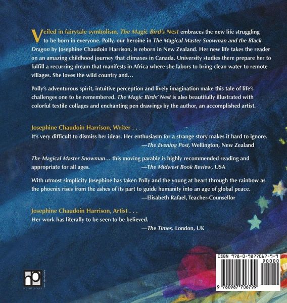 Veiled in fairytale symbolism, The Magic Bird's Nest embraces the new life struggling to be born in everyone. Polly, our heroine in The Magical Master Snowman and the Black Dragon by Josephine Chaudoin Harrison, is reborn in New Zealand. Her new life takes the reader on an amazing childhood journey that climaxes in Canada. University studies there prepare her to fulfill a recurring dream that manifests in Africa where she labors to bring clean water to remote villages. She loves the wild country and… Polly's adventurous spirit, intuitive perception and lively imagination make this tale of life's challenges one to be remembered. The Magic Birds' Nest is also beautifully illustrated with colorful textile collages and enchanting pen drawings by the author, an accomplished artist. Josephine Chaudoin Harrison, Writer . . . It's very difficult to dismiss her ideas. Her enthusiasm for a strange story makes it hard to ignore. -The Evening Post, Wellington, New Zealand The Magical Master Snowman… this moving parable is highly recommended reading and appropriate for all ages. -The Midwest Book Review, USA With utmost simplicity Josephine has taken Polly and the young at heart through the rainbow as the phoenix rises from the ashes of its part to guide humanity into an age of global peace. -Elisabeth Rafael, Teacher-Counsellor Josephine Chaudoin Harrison, Artist . . . Her work has literally to be seen to be believed. -The Times, London, UK