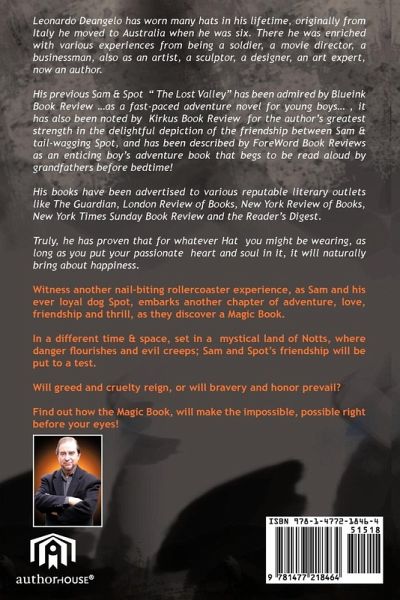 Leonardo Deangelo has worn many hats in his lifetime, originally from Italy he moved to Australia when he was six. There he was enriched with various experiences from being a soldier, a movie director, a businessman, also as an artist, a sculptor, a designer, an art expert, now an author. His previous Sam & Spot "The Lost Valley" has been admired by Blueink Book Review ...as a fast-paced adventure novel for young boys... , it has also been noted by Kirkus Book Review for the author's greatest strength in the delightful depiction of the friendship between Sam & tail-wagging Spot, and has been described by ForeWord Book Reviews as an enticing boy's adventure book that begs to be read aloud by grandfathers before bedtime! His books have been advertised to various reputable literary outlets like The Guardian, London Review of Books, New York Review of Books, New York Times Sunday Book Review and the Reader's Digest. Truly, he has proven that for whatever Hat you might be wearing, as long as you put your passionate heart and soul in it, it will naturally bring about happiness. Witness another nail-biting rollercoaster experience, as Sam and his ever loyal dog Spot, embarks another chapter of adventure, love, friendship and thrill, as they discover a Magic Book. In a different time & space, set in a mystical land of Notts, where danger flourishes and evil creeps; Sam and Spot's friendship will be put to a test. Will greed and cruelty reign, or will bravery and honor prevail? Find out how the Magic Book, will make the impossible, possible right before your eyes!