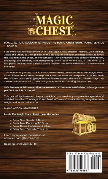 MAGIC. ACTION. ADVENTURE. INSIDE THE MAGIC CHEST BOOK FOUR - SEASIDE TREASURE Step into a world of excitement with "The Magic Chest: Seaside Treasure." Join siblings, Jessie and Ethan, as they go back to the attic again and open the magic chest to reveal the last item in the chest...an old compass. It isn't long before the sands of time return, encircling the children, and transporting them back to the 1950's, this time to a fast-paced adventure on a beach where they run into some old friends.... and some old enemies! This wonderful journey back in time answers many questions about the magic chest. When Ethan finds a treasure map, the adventure takes an unexpected turn and leads the children on an exciting expedition to find treasure at the beach! Unfortunately, they also run into trouble with three bad guys who are also hunting the treasure! Will Jessie and Ethan ever find the treasure or the secret behind the old compass to get back to John's Island? This beautifully illustrated chapter book is a captivating story filled with magic, action, and adventure, a must-read for young readers aged 6 to 10. READ THE ENTIRE MAGIC CHEST BOOK SERIES ¿ Book 1: Sands of Time ¿ Book 2: Dancing Til' Dusk ¿ Book 3: Halloween Hideout ¿ Book 4: Seaside Treasure Reading Level: Ages 6 - 10