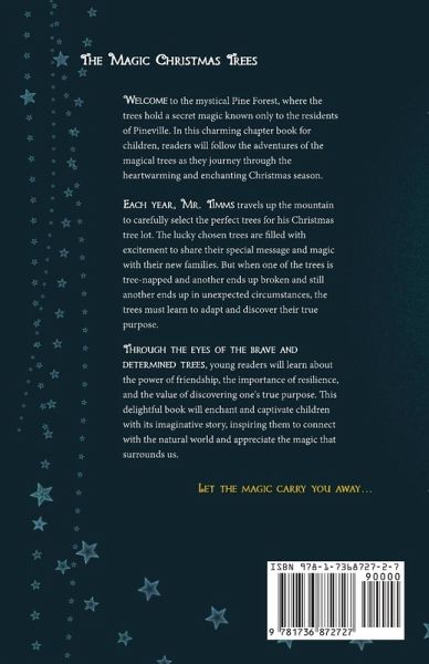 Welcome to the mystical Pine Forest, where the trees hold a secret magic known only to the residents of Pineville. In this charming chapter book for children, readers will follow the adventures of the magical trees as they journey through the heartwarming and enchanting Christmas season. Each year, Mr. Timms travels up the mountain to carefully select the perfect trees for his Christmas tree lot. The lucky chosen trees are filled with excitement to share their special message and magic with their new families. But when one of the trees is tree-napped and another ends up broken and still another ends up in unexpected circumstances, the trees must learn to adapt and discover their true purpose. Through the eyes of the brave and determined trees, young readers will learn about the power of friendship, the importance of resilience, and the value of discovering one's true purpose. This delightful book will enchant and captivate children with its imaginative story, inspiring them to connect with the natural world and appreciate the magic that surrounds us.
