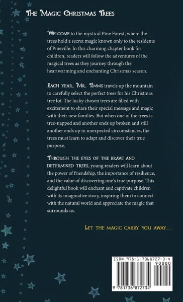 Welcome to the mystical Pine Forest, where the trees hold a secret magic known only to the residents of Pineville. In this charming chapter book for children, readers will follow the adventures of the magical trees as they journey through the heartwarming and enchanting Christmas season. Each year, Mr. Timms travels up the mountain to carefully select the perfect trees for his Christmas tree lot. The lucky chosen trees are filled with excitement to share their special message and magic with their new families. But when one of the trees is tree-napped and another ends up broken and still another ends up in unexpected circumstances, the trees must learn to adapt and discover their true purpose. Through the eyes of the brave and determined trees, young readers will learn about the power of friendship, the importance of resilience, and the value of discovering one's true purpose. This delightful book will enchant and captivate children with its imaginative story, inspiring them to connect with the natural world and appreciate the magic that surrounds us.