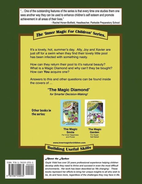 It's a lovely hot summer's day. Ally, Joy and Xavier are off for a swim in their favourite little pool but Igno the Ignoramus has infected it with a spell of 'ignorance'. How can they return their pool to it's natural beauty? What is a 'Magic Diamond' and why can't it be bought? How can You acquire one? Answers to this and other questions can be found inside the covers of 'The Magic Diamond'. Rationale: We have as many neurons (thinking cells) in our brains (the intellect) as we do in our hearts (emotional intelligence) and our guts (instinctive intelligence - martial artists call this your 'Central Power'). 'The Magic Diamond' draws readers' attention to these intelligences and uses standard academic practice of primary research and desk research to formulate their own conclusions, thus providing a blueprint for children on 'how' to evaluate and think for themselves. About the Inner Magic for Children series: "As the twig is bent, so grows the tree" Alexander Pope The 'Inner Magic For Children' series are fully illustrated, comical 'thinking stories' that help children build inner strengths and resilience in their formative years. The stories were borne from research conducted amongst children, who identified challenges they most needed help with, which responses correspond exactly with Maslow's 'Hierarchy of Needs'. All stories have a cheeky villain who represent a challenge children requested help with and a formula for overcoming it.