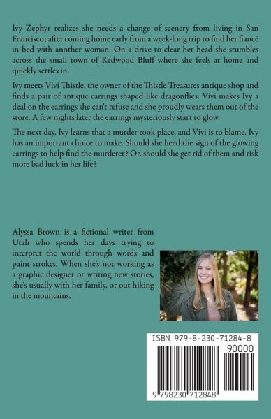 Ivy Zephyr realizes she needs a change of scenery from living in San Francisco; after coming home early from a week-long trip to find her fiancé in bed with another woman. On a drive to clear her head she stumbles across the small town of Redwood Bluff where she feels at home and quickly settles in. Ivy meets Vivi Thistle, the owner of the Thistle Treasures antique shop and finds a pair of antique earrings shaped like dragonflies. Vivi makes Ivy a deal on the earrings she can't refuse and she proudly wears them out of the store. A few nights later the earrings mysteriously start to glow. The next day, Ivy learns that a murder took place, and Vivi is to blame. Ivy has an important choice to make. Should she heed the sign of the glowing earrings to help find the murderer? Or, should she get rid of them and risk more bad luck in her life?