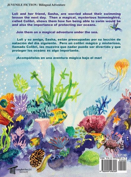 The bilingual (English/Spanish) whimsical tale with bright, captivating watercolors gently touches on the value of recognizing and overcoming fear, highlights marine conservation, and portrays multicultural friendship. The main characters, two young girls, Loli and Sasha are nervous about taking swimming lessons. A mysterious hummingbird, Colibri takes them on a magical under-the-sea adventure. The girls discover how much fun swimming can be, plus they learn the importance of protecting our oceans. Cleverly woven into the storyline is a beautiful rhyming song about the fascinating sea animals the girls encounter. Music and lyrics of the under-the-sea song plus fun ocean and animal facts are included.