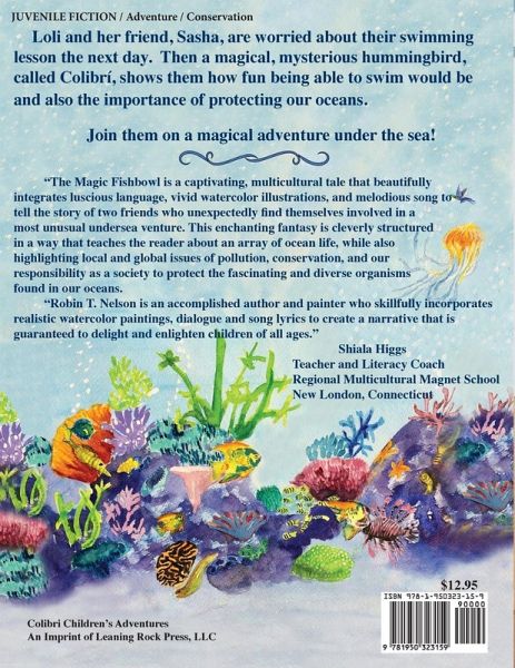 This whimsical tale with bright, captivating watercolors gently touches on the value of recognizing and overcoming fear, highlights marine conservation, and portrays multicultural friendship. The main characters, two young girls, Loli and Sasha are nervous about taking swimming lessons. A mysterious hummingbird, Colibri, takes them on a magical under-the-sea adventure that is designed to not only boost their confidence about learning to swim but is devised to teach them about the impressive array of sea life and how they can respect and care for the ocean environment. Cleverly woven into the storyline is a beautiful rhyming song about the fascinating sea animals the girls encounter. The music and lyrics of the under-the-sea song plus fun ocean and animal facts are included.