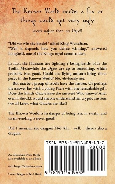 The Known World needs a fix or things could get very ugly (even uglier than an Ogre!) "Did we win the battle?" asked King Wyndham. "Well it depends how you define winning," answered Longfield, one of the King's royal commanders. In fact, the Humans are fighting a losing battle with the Trolls. Meanwhile the Ogres are up to something, which probably isn't good. Could one flying unicorn bring about peace in the Known World? No, obviously not. But maybe a group of rebels have the answer. Or perhaps the answer lies with a young Pixie with one remarkable gift. Does the Elvish Oracle have the answer? Who knows? And, even if she did, would anyone understand her cryptic answers (we all know what Oracles are like!) The Known World is in danger of being rent in twain, and twain-rending is never good! Did I mention the dragon? No? Ah... well... there's also a dragon. Cover design: A and S Buck
