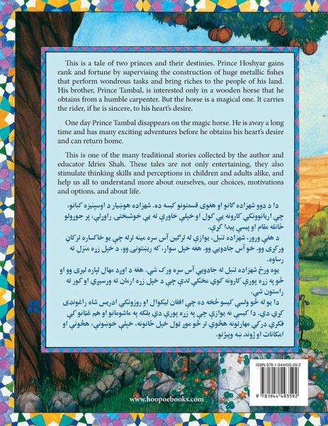 (Bilingual English-Pashto edition) This is the story of two brothers: one skilled in the practical arts and the other, Prince Tambal, considered by most people to be only a dreamer. Their father, the king, announces a competition to produce "interesting and useful devices." The entry produced by a woodcarver appears to be only a simple wooden horse of little value, but when Tambal looks more closely, he discovers that it's able to magically travel to whatever place is in its rider's mind. With the help of this magic horse, Tambal comes to learn a great many things and, eventually, to know his heart's desire. Julie Freeman's beautiful illustrations capture the magic of this tale, with the images and text inset in rich borders of oriental patterns. The Magic Horse is one of an illustrated series of Sufi teaching stories from the Middle East and Central Asia that were collected and adapted for children by Idries Shah, and that have captivated hearts and minds for more than a thousand years. The stories are designed to help children learn to examine their assumptions and to think for themselves. In the Sufi tradition, there is a continuum between the children's story, the entertainment or folklore story and the instructional or instrumental story. A story can help children deal with difficult situations and give them something to hold on to, but it can also stimulate a deeper understanding in adults. Through the instrumental function of this rich body of material, readers of all ages can learn to develop the capacity to be more flexible and to understand many more things about themselves and about life.