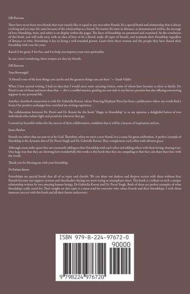 DR Rawson There have never been two friends that were exactly like or equal to any two other friends. It's a special bond and relationship that is always evolving and yet stays the same because of the relationship as a friend. No matter the time or distance, as demonstrated within, the message of love, friendship, trust, and safety is on display within the pages. The faces of friendship are presented and examined. At the conclusion of this book, you will walk away with an idea of how to be a friend, make all types of friends, and maintain their friendship regardless of distance or time. Friendship is key to being a well-rounded person. Learn from these women and the people they have shared their friendship with over the years. Rated G for great, F for fun, and S to help you improve your own spirituality. In case you're wondering, these women are also my friends. DR Rawson Yana Bostongirl "A friend is one of the best things you can be and the greatest things you can have."¿-¿Sarah Valdez When I first started writing, I had no idea that I would meet some amazing writers, some of whom have become as close as family. Dr. Preeti is one of them and more than that¿-¿she is a soulful mentor, guiding me not only in my literary pursuits but also offering unwavering support in my personal life. Another cherished connection is with Dr. Gabriella Korosi, whose Dancing Elephant Press has been a publication where my words find a home.Our positive exchanges have enriched my writing experience. The collaboration between Dr. Preeti and Dr. Korosi for the book "Magic in Friendship" is, in my opinion, a delightful fusion of two individuals who radiate light and positivity wherever they go. I extend my heartfelt wishes for the success of their collaboration, confident that it will be a beacon of inspiration and joy. James Boylan Friends are others that are sent to us by God. Therefore, when we meet a new friend, it is a cause for great celebration. A perfect example of friendship is the dynamic duo of Dr. Preeti Singh and Dr. Gabriella Korosi. They complement each other with obvious grace. Although many miles apart they are constantly adding to their friendship with each other and adding others with their loving, sharing ways. One huge way that they are showing how wonderfully this works is this book that they are compiling so that they can share their love with the world. Thank you for blessing me with your friendship. Dr.Fatima Imam Friendships are special bonds that all of us enjoy and cherish. We can share our darkest and deepest secrets with them without fear. Friends become our support systems and cheerleaders during our most trying or triumphant times. This book is a tribute to such a unique relationship written by two amazing human beings, Dr Gabriella Korosi and Dr. Preeti Singh. Both of them are perfect examples of what friendships really stand for. Their insight on this topic is a must-read for everyone who values friends and their friendships. I wish them immense success with this book and all their future endeavours.