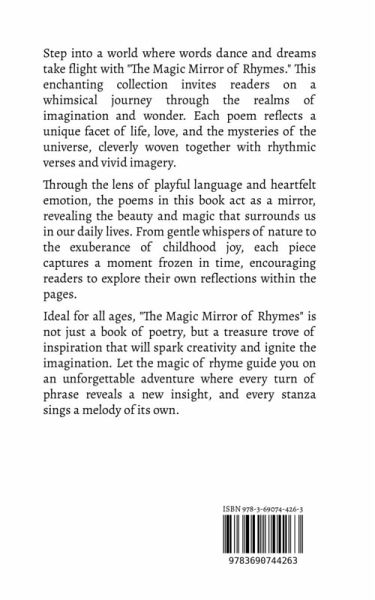 Step into a world where words dance and dreams take flight with "The Magic Mirror of Rhymes." This enchanting collection invites readers on a whimsical journey through the realms of imagination and wonder. Each poem reflects a unique facet of life, love, and the mysteries of the universe, cleverly woven together with rhythmic verses and vivid imagery. Through the lens of playful language and heartfelt emotion, the poems in this book act as a mirror, revealing the beauty and magic that surrounds us in our daily lives. From gentle whispers of nature to the exuberance of childhood joy, each piece captures a moment frozen in time, encouraging readers to explore their own reflections within the pages. Ideal for all ages, "The Magic Mirror of Rhymes" is not just a book of poetry, but a treasure trove of inspiration that will spark creativity and ignite the imagination. Let the magic of rhyme guide you on an unforgettable adventure where every turn of phrase reveals a new insight, and every stanza sings a melody of its own.