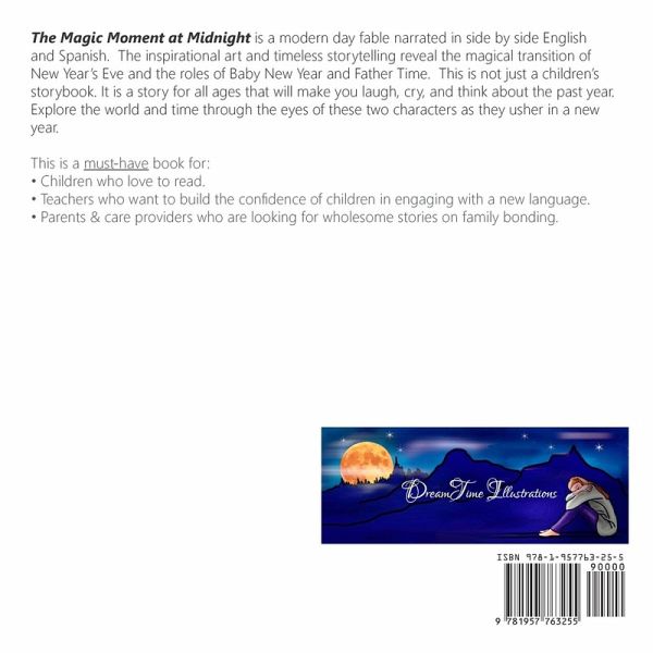 The Magic Moment at Midnight is a modern day fable narrated in side by side English and Spanish. The inspirational art and timeless storytelling reveal the magical transition of New Year's Eve and the roles of Baby New Year and Father Time. This is not just a children's storybook. It is a story for all ages that will make you laugh, cry, and think about the past year. Explore the world and time through the eyes of these two characters as they usher in a new year. This is a must-have book for: ¿ Children who love to read. ¿ Teachers who want to build the confidence of children in engaging with a new language. ¿ Parents & care providers who are looking for wholesome stories on family bonding. This children's picture book is part of the wonderful The 365 Bedtime Stories Collection by Querida Lu Ahn Funck.