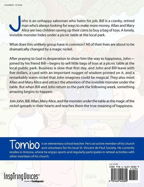 John is an unhappy salesman who hates his job. Bill is a cranky, retired man who's always looking for ways to make more money. Allan and Mary Alice are two children saving up their coins to buy a bag of toys. A lonely, invisible monster hides under a picnic table at the local park. What does this unlikely group have in common? All of their lives are about to be dramatically changed by a magic nickel. After praying to God in desperation to show him the way to happiness, John- joined by his friend Bill-begins to sell little bags of toys at a picnic table at the local public park. Business is slow that first day, and John and Bill leave with five dollars, a card with an important nugget of wisdom printed on it, and a remarkably warm nickel that John imagines could be magical. They also meet Allan and Mary Alice and attract the attention of the invisible monster under the table. But when Bill and John return the park the following week, something amazing begins to happen. Join John, Bill, Allan, Mary Alice, and the monster under the table as the magic of the nickel spreads in their hearts and teaches them the true meaning of happiness.