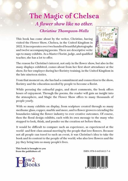 This book has come about by the writer, Christine, having visited the Flower Show, Chelsea, in the United Kingdom in 2022. It incorporates over two hundred beautiful photographs and thirteen accompanying poems. There are descriptive write ups to many exhibits. As a Master Florist, judge, and qualified teacher, she has a lot to offer. The reason for Christine's interest, not only in the flower show, but also in the many displays exhibited, comes about from her first short attendance at the show, for her employer during her floristry training in the United Kingdom in the late nineteen sixties. From that moment on, she has had a commitment and connection to the show, floristry and the education needed by people to become a florist. While perusing the colourful pages, and short comments, the book offers hours of enjoyment. Through the poems, the reader will gain an insight into the atmosphere, and the Magic the Flower Show offers to many thousands of people yearly. With so many exhibits on display, from sculpture created through so many mediums: glass, copper, marble and more, and to flower growers extending the boundaries taking the flower industry to ever creative outcomes. Of course, then the floral design exhibits, each with its own message to the many who stopped to look, think, and ponder on the creation set before them. It would be difficult to compare such an experience, as experienced at the world- and first-class annual meeting by the people that love flowers. Because not all people can travel to such an event, it was Christine's idea to take the book and its content to the people of the world, who also love flowers and the joy they bring into so many people's lives.