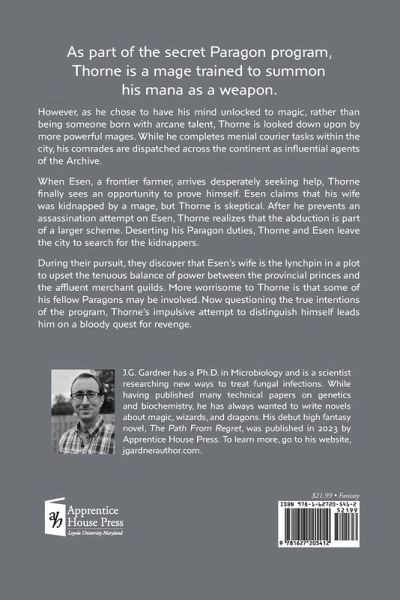 As part of the secret Paragon program, Thorne is a mage trained to summon his mana as a weapon. However, as he chose to have his mind unlocked to magic, rather than being someone born with arcane talent, Thorne is looked down upon by more powerful mages. While he completes menial courier tasks within the city, his comrades are dispatched across the continent as influential agents of the Archive. When Esen, a frontier farmer, arrives desperately seeking help, Thorne finally sees an opportunity to prove himself. Esen claims that his wife was kidnapped by a mage, but Thorne is skeptical. After he prevents an assassination attempt on Esen, Thorne realizes that the abduction is part of a larger scheme. Deserting his Paragon duties, Thorne and Esen leave the city to search for the kidnappers.During their pursuit, they discover that Esen's wife is the lynchpin in a plot to upset the tenuous balance of power between the provincial princes and the influential merchant guilds. More worrisome to Thorne is that some of his fellow Paragons may be involved. Now questioning the true intentions of the Paragon program, Thorne's impulsive attempt to distinguish himself leads him on a bloody quest for revenge.