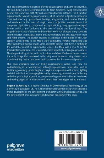 This book demystifies the notion of living consciousness and aims to show that, far from being a mere accompaniment to brain functions, living consciousness defines the features of both physical objects and human artifacts. The distinction is between living consciousness, which includes subjective experiences 'here and now' (e.g., perceptions, feelings, imagination, and creative thinking) and conforms to the laws of magic, versus objectified consciousness that comprises physical (e.g., computers) and symbolic (e.g., languages and concepts) human artifacts and conforms to the laws of nature and formal logic.