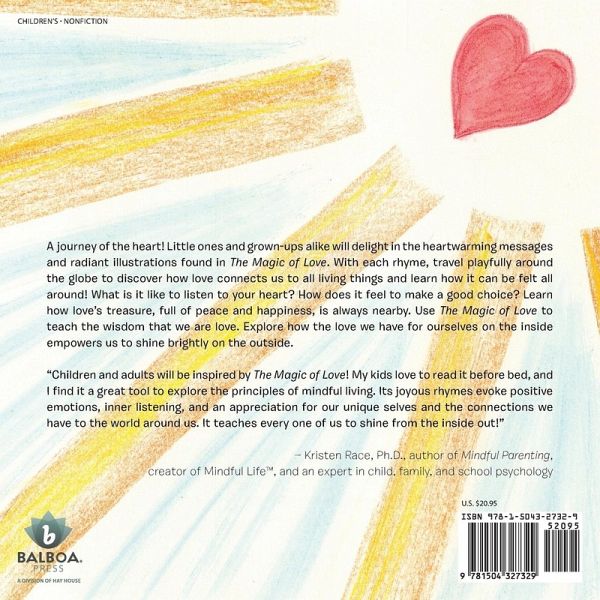 A journey of the heart! Little ones and grown-ups alike will delight in the heartwarming messages and radiant illustrations found in The Magic of Love. With each rhyme, travel playfully around the globe to discover how love connects us to all living things and learn how it can be felt all around! What is it like to listen to your heart? How does it feel to make a good choice? Learn how love's treasure, full of peace and happiness, is always nearby. Use The Magic of Love to teach the wisdom that we are love. Explore how the love we have for ourselves on the inside empowers us to shine brightly on the outside. "Children and adults will be inspired by The Magic of Love! My kids love to read it before bed, and I find it a great tool to explore the principles of mindful living. Its joyous rhymes evoke positive emotions, inner listening, and an appreciation for our unique selves and the connections we have to the world around us. It teaches every one of us to shine from the inside out!" - Kristen Race, Ph.D., author of Mindful Parenting, creator of Mindful Life¿, and an expert in child, family, and school psychology