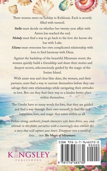 Three women meet on holiday in Kefalonia. Each is secretly filled with turmoil. Stella must decide on whether her twenty-year affair with Anton has reached the end. Melody must find a way to go back to the love she knows she has with Luke. Eliana must overcome her own complicated relationship with love to find harmony with Dean. Against the backdrop of the beautiful Miramare resort, the women quickly build a friendship and share their stories and deepest secrets, subconsciously guided by the magic of the Ionian Island. With azure seas and clear blue skies, the women, and their partners, must find a way to nurture themselves before they can salvage their own relationships while navigating their attitudes to love. But can they find their way to a kinder, better place within themselves. The Greeks have so many words for love, that they are guided and find a way through their own turmoil, to find the real happiness, love, and magic that exists within us all.Follow strong, authentic female characters who have drive, sass, and attitude in this poetic narrative with a stunningly slow simmer. It's a story that will capture your heart. Disappear into a world of love .... into The Magic of Miramare.