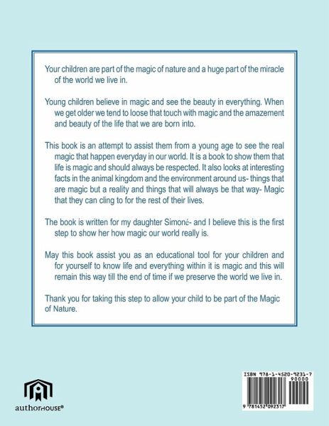 Your children are part of the magic of nature and a huge part of the miracle of the world we live in. Young children believe in magic and see the beauty in everything. When we get older we tend to loose that touch with magic and the amazement and beauty of the life that we are born into. This book is an attempt to assist them from a young age to see the real magic that happen everyday in our world. It is a book to show them that life is magic and should always be respected. It also looks at interesting facts in the animal kingdom and the environment around us- things that are magic but a reality and things that will always be that way- Magic that they can cling to for the rest of their lives. The book is written for my daughter Simoné- and I believe this is the first step to show her how magic our world really is. May this book assist you as an educational tool for your children and for yourself to know life and everything within it is magic and this will remain this way till the end of time if we preserve the world we live in. Thank you for taking this step to allow your child to be part of the Magic of Nature.
