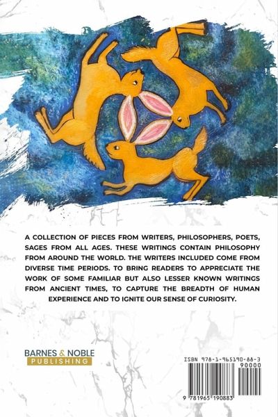 A COLLECTION OF PIECES FROM WRITERS, PHILOSOPHERS, POETS, SAGES FROM ALL AGES. THESE WRITINGS CONTAIN PHILOSOPHY FROM AROUND THE WORLD. THE WRITERS INCLUDED COME FROM DIVERSE TIME PERIODS. TO BRING READERS TO APPRECIATE THE WORK OF SOME FAMILIAR BUT ALSO LESSER KNOWN WRITINGS FROM ANCIENT TIMES, TO CAPTURE THE BREADTH OF HUMAN EXPERIENCE AND TO IGNITE OUR SENSE OF CURIOSITY.