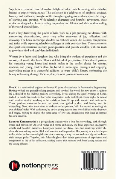 Step into a treasure trove of twelve delightful tales, each brimming with valuable lessons to inspire young minds. This collection is a celebration of kindness, courage, honesty, and resilience, brought to life through engaging stories that capture the magic of learning and growing. With relatable characters and heartfelt adventures, these stories are designed to leave a lasting impression on children and their understanding of the world around them. From a boy discovering the power of hard work to a girl pursuing her dreams with unwavering determination, every story offers moments of joy, reflection, and discovery. The book encourages children to embrace values like fairness, compassion, and unity while exploring relatable challenges in their everyday lives. These are stories that spark conversations, nurture good qualities, and provide children with the tools to grow into kind and confident individuals. Written by a father and daughter duo who bring the wisdom of experience and the curiosity of youth, this book offers a rich blend of perspectives. Their shared passion for nurturing young hearts and minds makes it the perfect choice for parents, teachers, and young readers alike. Its blend of meaningful messages and engaging storytelling makes it a wonderful addition to every child's library, celebrating the beauty of learning through life's simplest yet most profound moments.