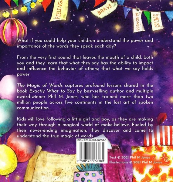 What if you could help your children understand the power and importance of the words they speak each day? From the very first sound that leaves the mouth of a child, both you and they learn that what they say has the ability to impact and influence the behavior of others; that what we say holds power. The Magic of Words captures profound lessons shared in the book Exactly What to Say by best-selling author and multiple award-winner Phil M. Jones, who has trained more than two million people across five continents in the lost art of spoken communication. Kids will love following a little girl and boy, as they are making their way through a magical world of make-believe. Fueled by their never-ending imagination, they discover and come to understand the true magic of words.