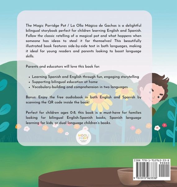 The Magic Porridge Pot / La Olla Mágica de Gachas is a delightful bilingual storybook perfect for children learning English and Spanish. Follow the classic retelling of a magical pot and what happens when someone has ideas to steal it for themselves! This beautifully illustrated book features side-by-side text in both languages, making it ideal for young readers and parents looking to boost language skills. Parents and educators will love this book for: Learning Spanish and English through fun, engaging storytellingSupporting bilingual education at homeVocabulary-building and comprehension in two languages Bonus: Enjoy the free audiobook in both English and Spanish by scanning the QR code inside the book! Perfect for children ages 0-8, this book is a must-have for families looking for bilingual English-Spanish books, Spanish language learning for kids, or dual language children's books. La Olla Mágica de Gachas / The Magic Porridge Pot es un encantador libro de cuentos bilingüe, perfecto para niños que están aprendiendo inglés y español. Sigue la clásica narración de una olla mágica y lo que sucede cuando alguien tiene ideas de robarla para sí mismo. Este libro bellamente ilustrado presenta texto en paralelo en ambos idiomas, lo que lo hace ideal para lectores jóvenes y padres que buscan mejorar las habilidades lingüísticas. A los padres y educadores les encantará este libro por: Aprender español e inglés a través de una narración divertida y atractiva.Apoyar la educación bilingüe en casa.Fomentar el aprendizaje de vocabulario y comprensión en dos idiomas. ¡Bono! Disfruta del audiolibro gratuito en inglés y español escaneando el código QR dentro del libro. Perfecto para niños de 0 a 8 años, este libro es imprescindible para familias que buscan libros bilingües en inglés y español, aprendizaje del idioma español para niños, o libros infantiles en dos idiomas.