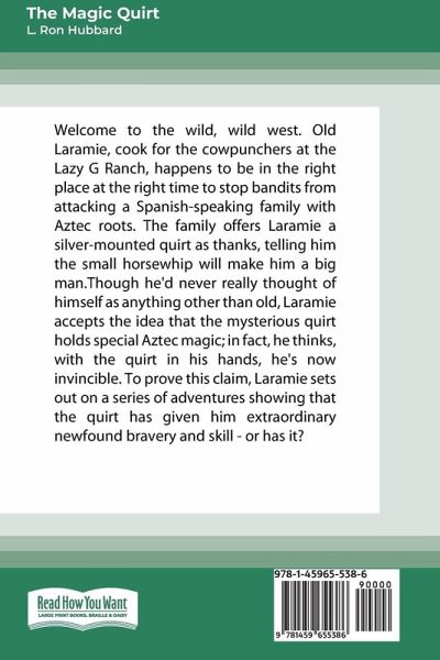 Welcome to the wild, wild west. Old Laramie, cook for the cowpunchers at the Lazy G Ranch, happens to be in the right place at the right time to stop bandits from attacking a Spanish - speaking family with Aztec roots. The family offers Laramie a silver - mounted quirt as thanks, telling him the small horsewhip will make him a big man.Though he'd never really thought of himself as anything other than old, Laramie accepts the idea that the mysterious quirt holds special Aztec magic; in fact, he thinks, with the quirt in his hands, he's now invincible. To prove this claim, Laramie sets out on a series of adventures showing that the quirt has given him extraordinary newfound bravery and skill - or has it? ALSO INCLUDES THE WESTERN STORIES ''VENGEANCE IS MINE!'' AND ''STACKED BULLETS'' ''...is pure entertainment from first page to last with that L. Ron Hubbard touch giving this tale an enduring reading engagement from beginning to end.'' - Midwest Book Review